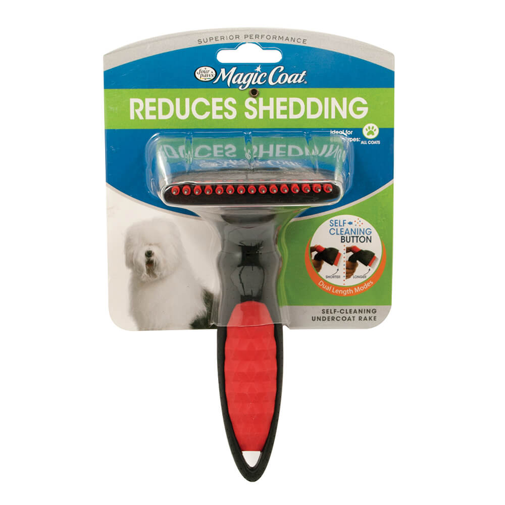 • The Four Paws® Magic Coat® Self-Cleaning Undercoat Rake is designed to perform 3 functions with an easy-to-use push button to gently remove dead hair, tangles, and mats while reducing shedding.